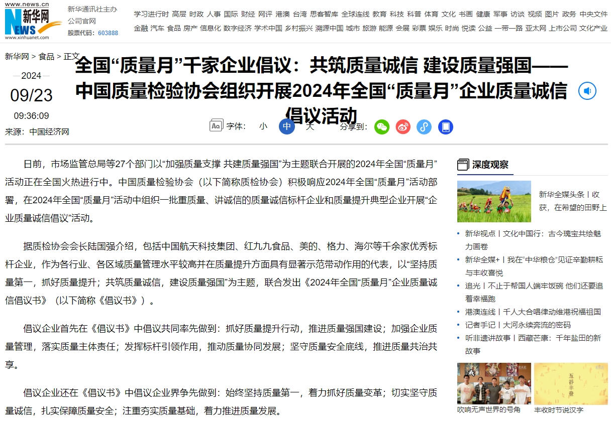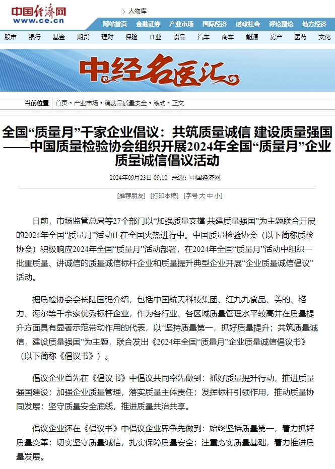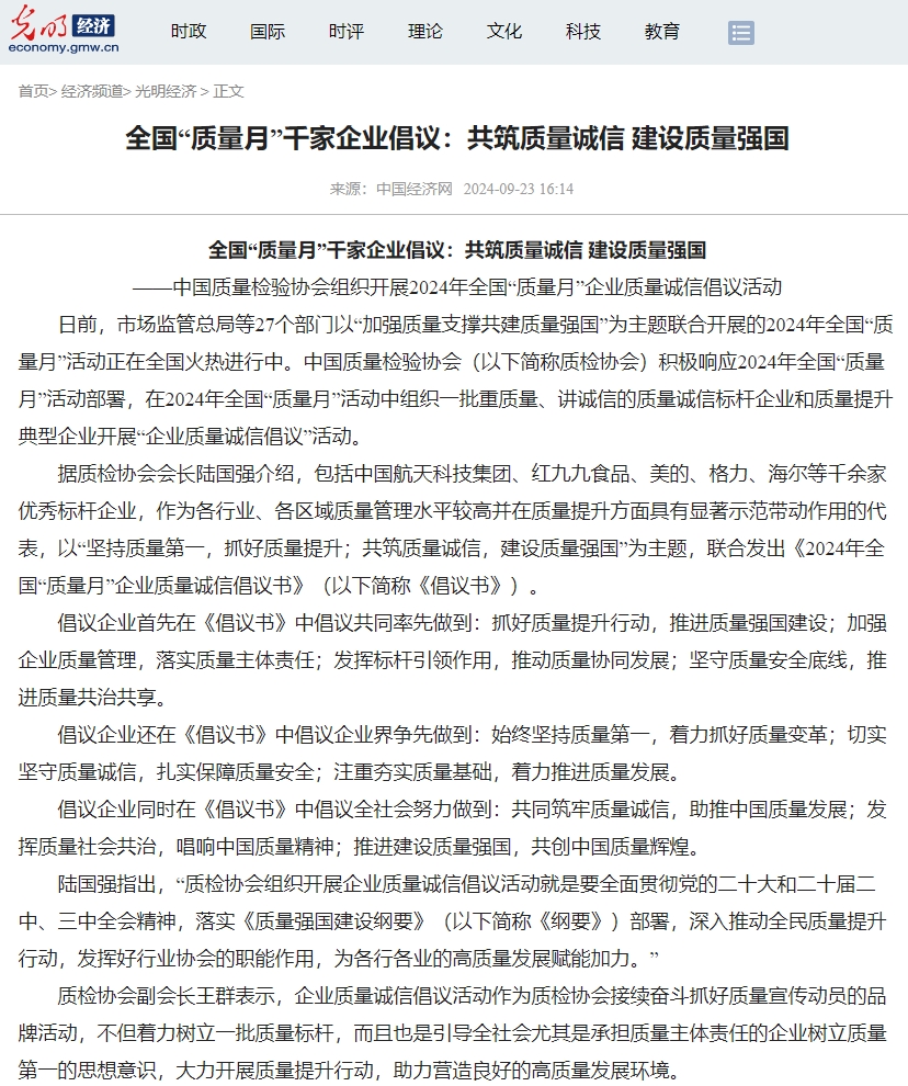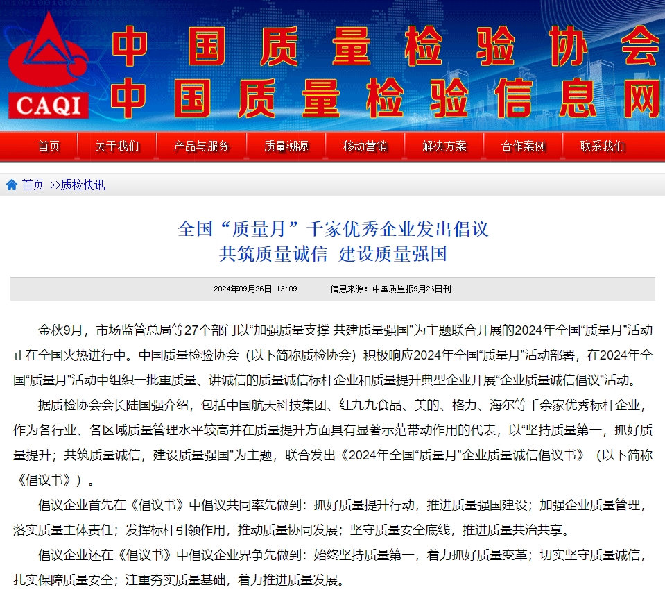 每年9月是全國“質(zhì)量月”,由市場監(jiān)管總局等27個部門以“加強(qiáng)質(zhì)量支撐 共建質(zhì)量強(qiáng)國”為主題,聯(lián)合開展的“質(zhì)量月”活動。在2024年全國“質(zhì)量月”活動中組織一批重質(zhì)量、講誠信的質(zhì)量誠信標(biāo)桿企業(yè)和質(zhì)量提升典型企業(yè)開展“企業(yè)質(zhì)量誠信倡議”活動。