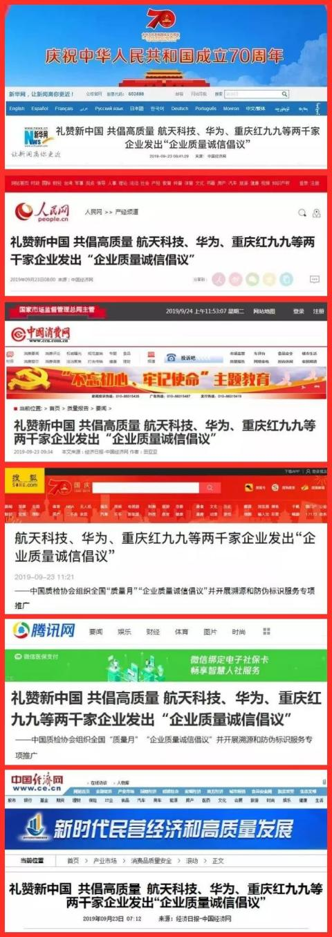 中國(guó)質(zhì)量檢驗(yàn)協(xié)會(huì)(以下簡(jiǎn)稱質(zhì)檢協(xié)會(huì))在活動(dòng)中組織重慶紅九九食品等近兩千家重質(zhì)量、講誠(chéng)信的質(zhì)量誠(chéng)信標(biāo)桿企業(yè)和質(zhì)量提升典型企業(yè),開展“企業(yè)質(zhì)量誠(chéng)信倡議”專題活動(dòng)。并以“堅(jiān)持質(zhì)量第一 抓好質(zhì)量提升 共筑質(zhì)量誠(chéng)信 建設(shè)質(zhì)量強(qiáng)國(guó)”為主題,以人民為中心,樹立消費(fèi)者至上的理念,把維護(hù)廣大群眾的根本利益作為“質(zhì)量月”活動(dòng)的出發(fā)點(diǎn)和落腳點(diǎn),聯(lián)合發(fā)出《2019年全國(guó)“質(zhì)量月”企業(yè)質(zhì)量誠(chéng)信倡議書》,倡議企業(yè)界爭(zhēng)先做到弘揚(yáng)工匠精神、齊抓質(zhì)量提升、重視質(zhì)量發(fā)展、共創(chuàng)中國(guó)質(zhì)量,以優(yōu)異成績(jī)慶祝中華人民共和國(guó)成立70周年。此次活動(dòng)引起社會(huì)廣泛贊譽(yù)。